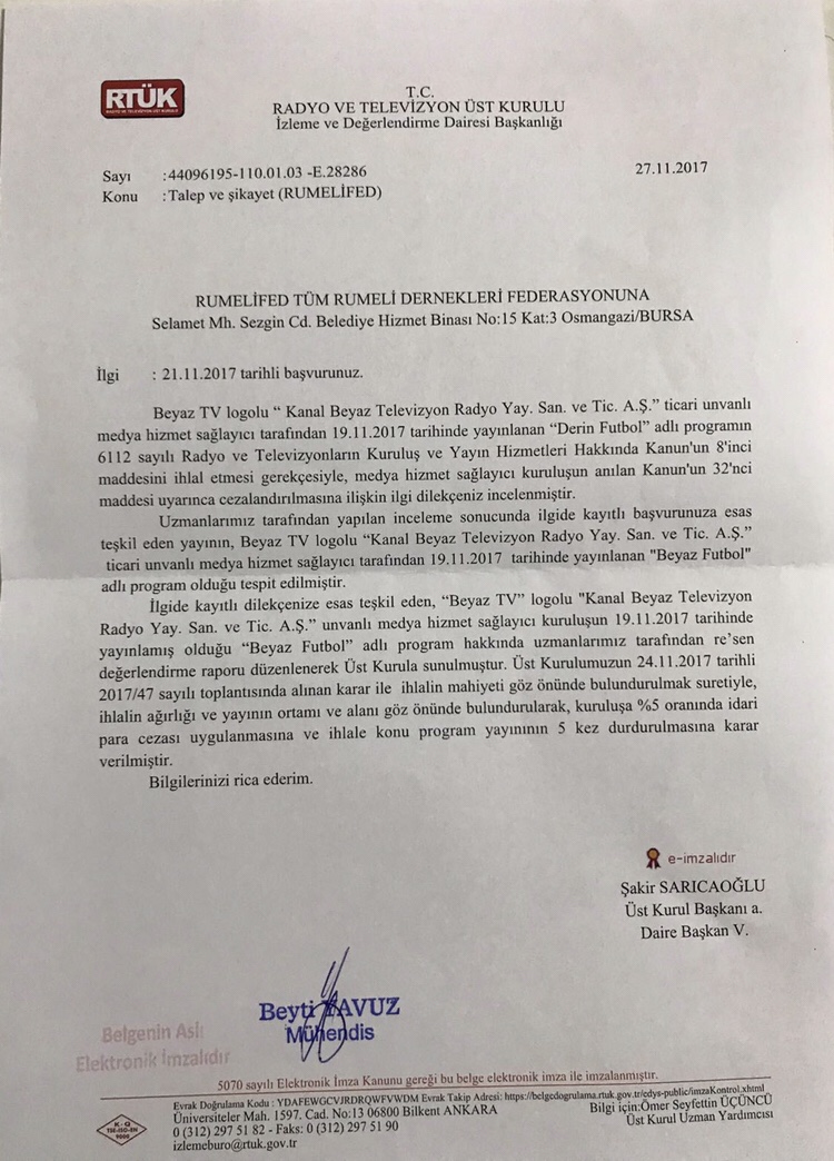 21/11/2017 tarihinde, federasyonumuz tarafından RTÜK’e gönderdiğimiz resmi yazıya istinaden gelen cevap, siz değerli Rumeli camiamızın bilgilerinize sunarız.